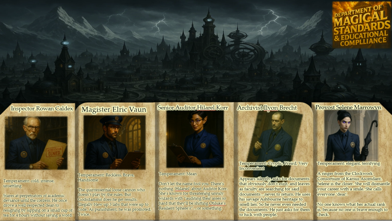 The train arrived at the Aetherforge and Ainsley distributed aliases and credentials identifying us as agents of the Department of Magical Standards and Educational Compliance. The designation carried the appropriate weight without inviting curiosity.